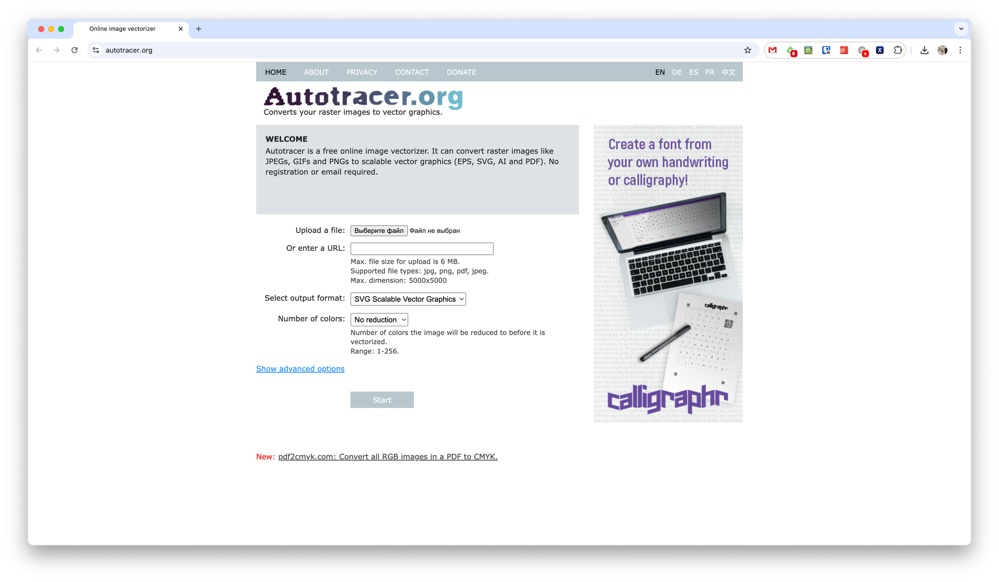 Ещё один бесплатный сервис для перевода растров в вектор. Отличается он от других тем, что вы можете скачать результат в разнообразных форматах, включая такие редкие, как DXF, FIG или SK. Также вы можете не загружать исходник на сайт, а добавить его URL-адрес.