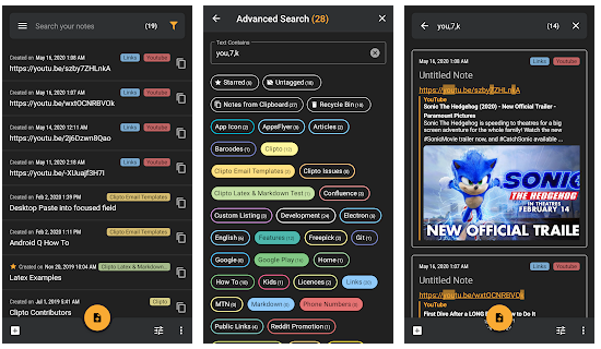 Клипы можно хранить в виде заметок с разбивкой по категориям. По заметкам есть поиск, их можно объединить или поделиться с друзьями.