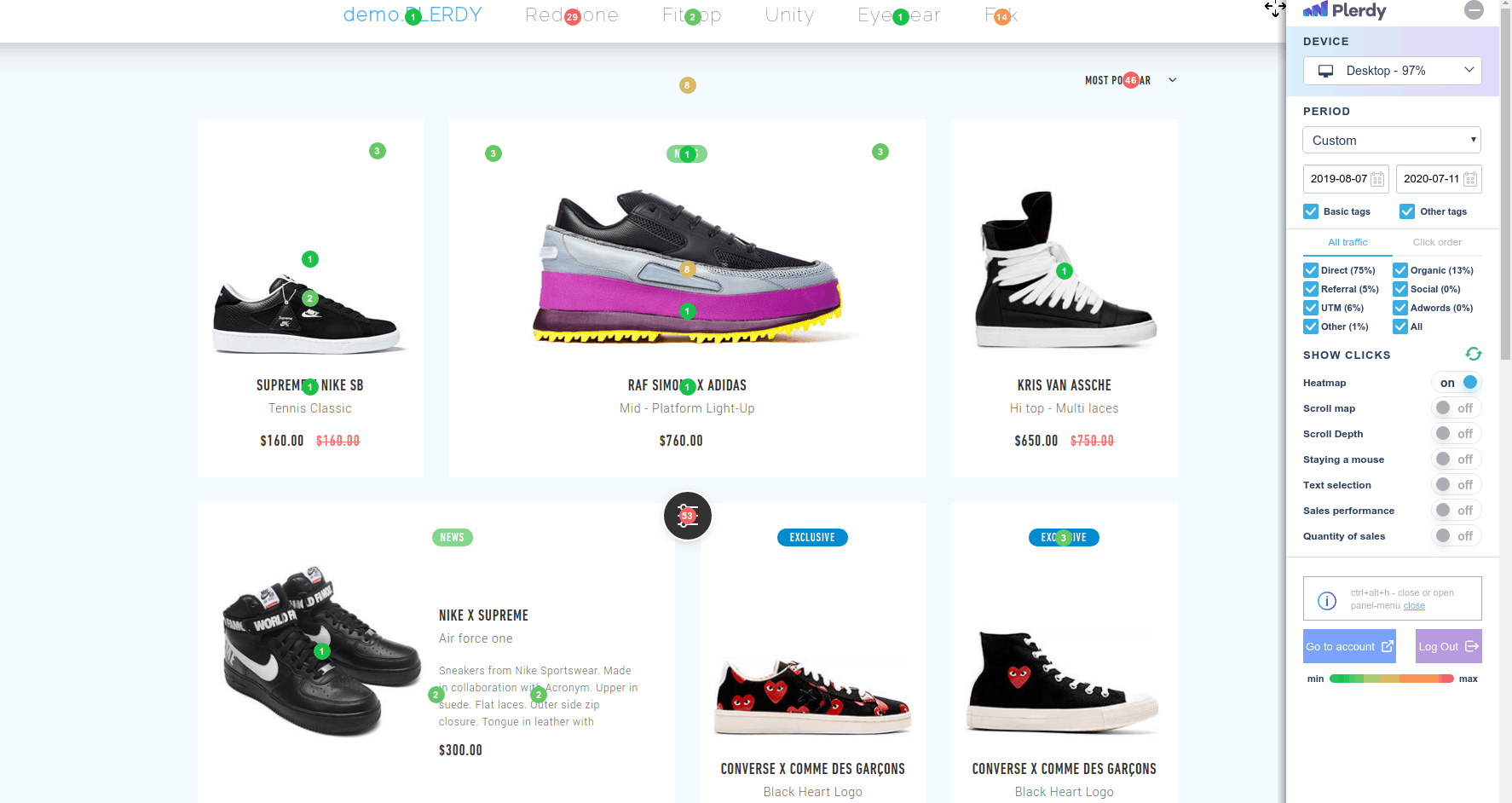 Вообще, это набор инструментов для оптимизации конверсии, но в нём есть и тепловые карты. Можно отслеживать клики, движения мыши и скролл. С помощью Plerdy можно отследить путь посетителя, что даст возможность оптимизировать расположение элементов на странице.