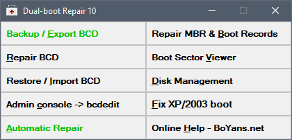 Утилита для исправления BCD-файлов. С её помощью вы сможете за пару кликов создать новый загрузчик для Винды 7/8.1/10/11 и виртуальных жёстких дисков (VHD). А также пофиксить MBR, загрузочные записи, сектора и прочее.
