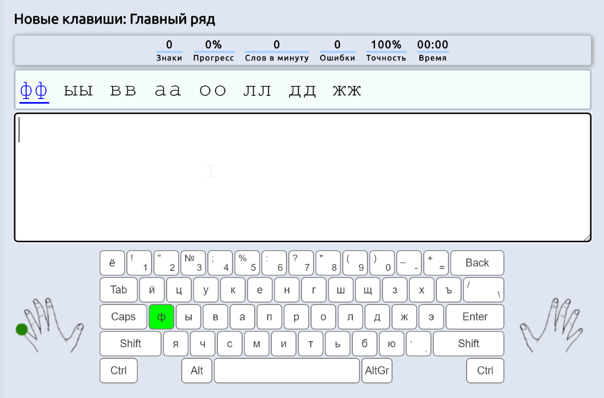 Вы будете видеть виртуальную клавиатуру, на которой изображены английские буквы. Каждая зона окрашена в специальный цвет, который соответствует определённому пальцу. Комплекс упражнений опирается на многократное повторение слов, которые часто встречаются. Такой подход помогает освоить печать в автоматическом режиме.