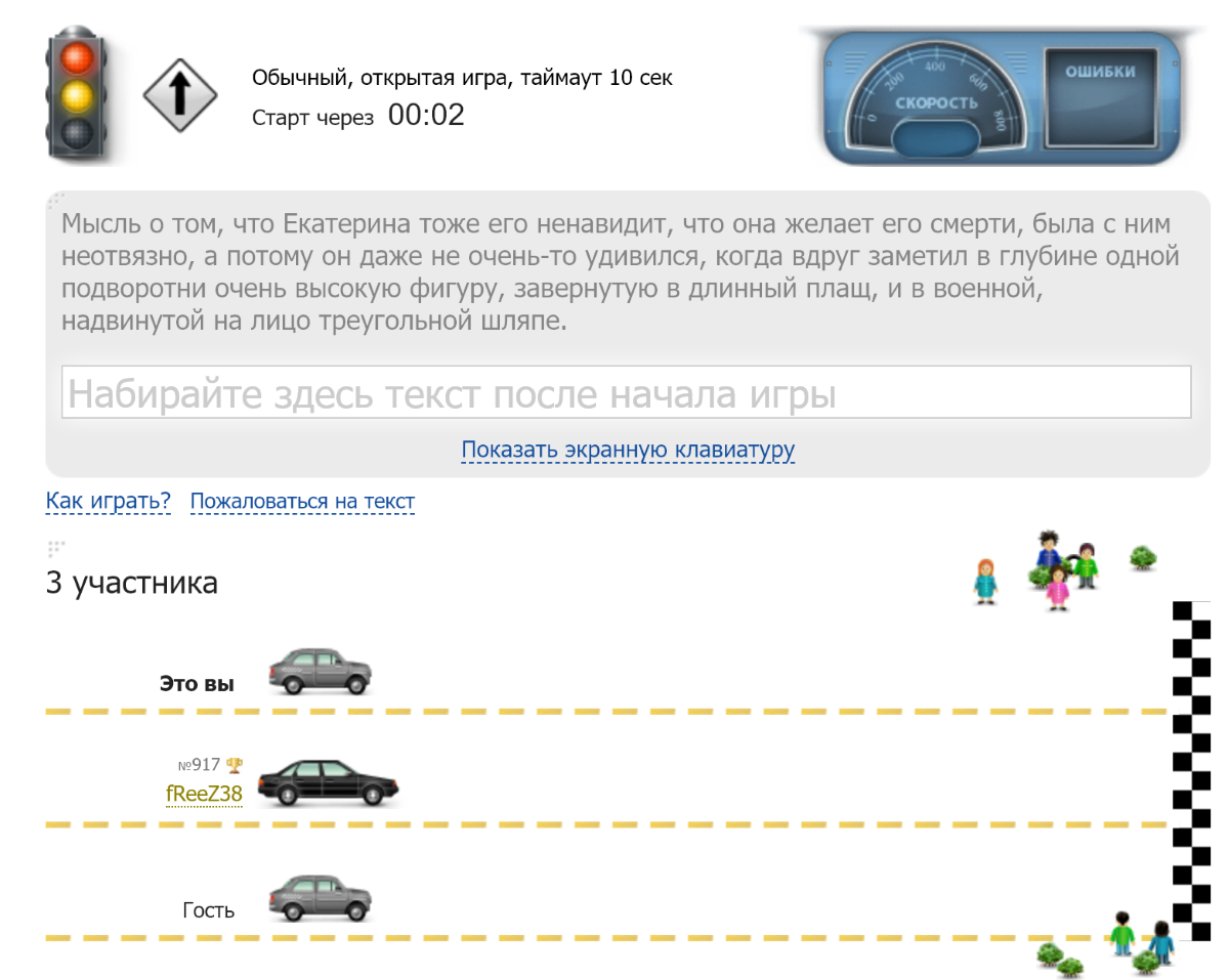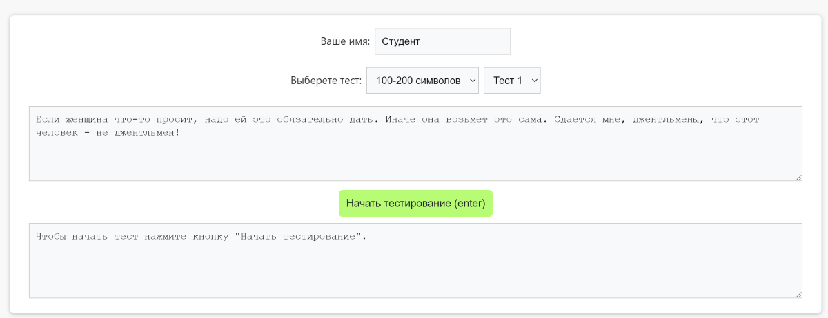 Сервис в первую очередь предлагает пройти специальный тест, определяющий темп печати. Объём текста можно выбрать самостоятельно. Система рассчитает скорость печати, а также покажет число ошибок, которые были допущены.