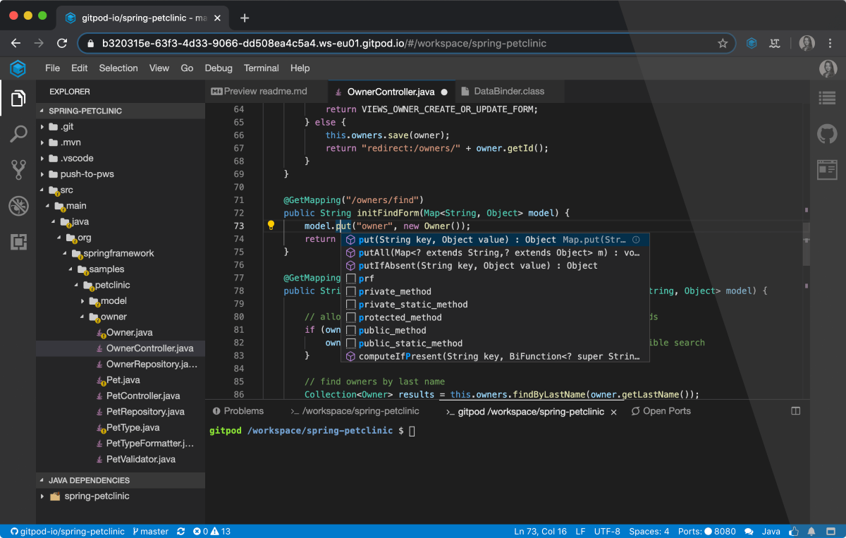 GitPod предоставляет готовые среды разработки, которые благодаря мощным движкам существенно ускоряют сборку кода. С помощью GitPod IDE можно выбирать любые проекты из GitHub, клонировать репозиторий и начинать кодировать онлайн. Такие компании, как Google, Amazon, Facebook и Uber, используют именно эту платформу, во многом благодаря её надёжности. GitPod, основанный на Theia IDE, имеет интуитивно понятный интерфейс, который помогает разработчикам быстро адаптироваться к онлайн-кодированию.