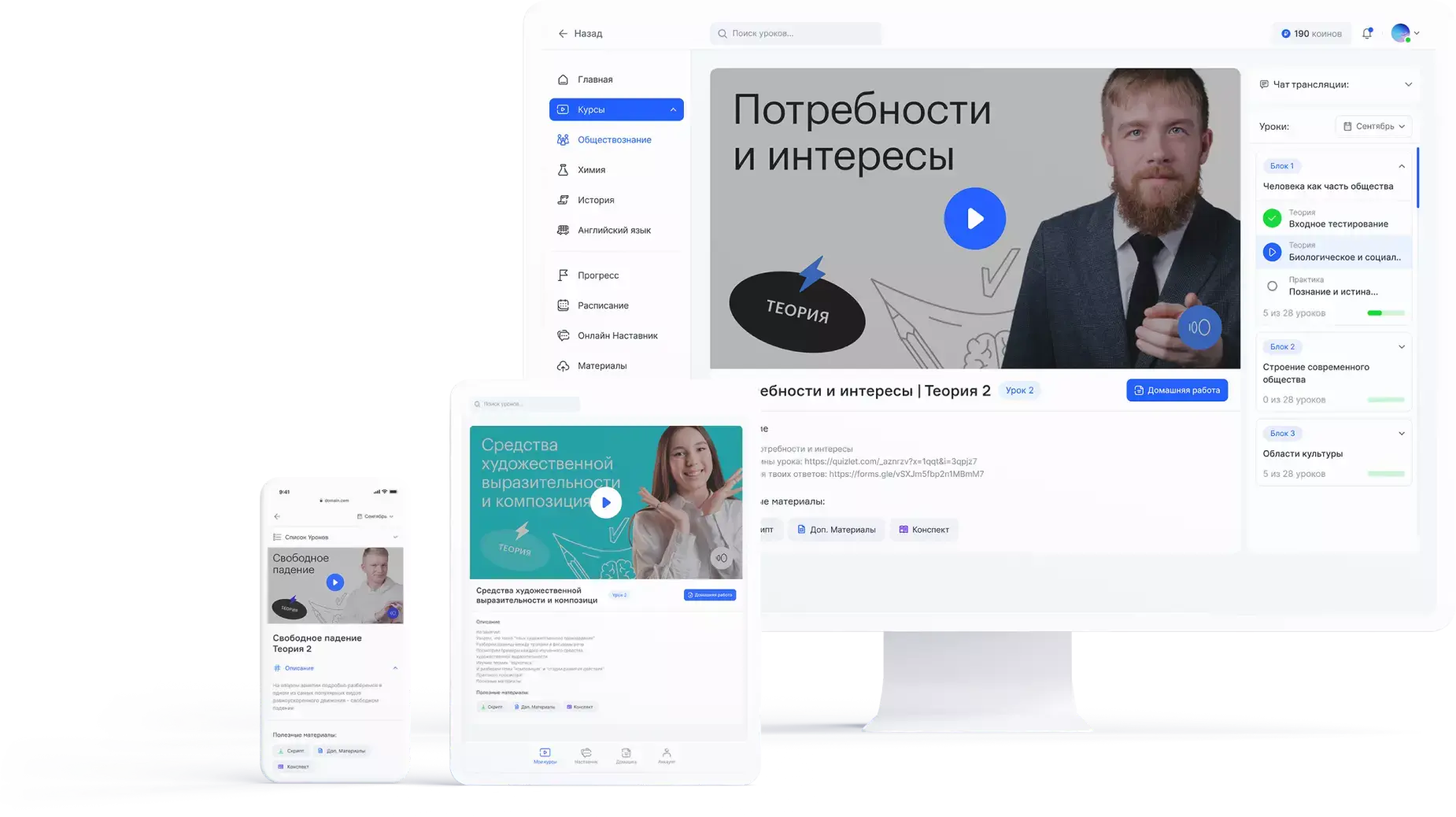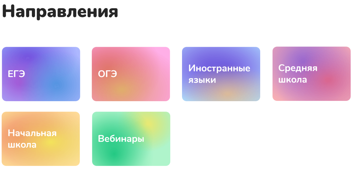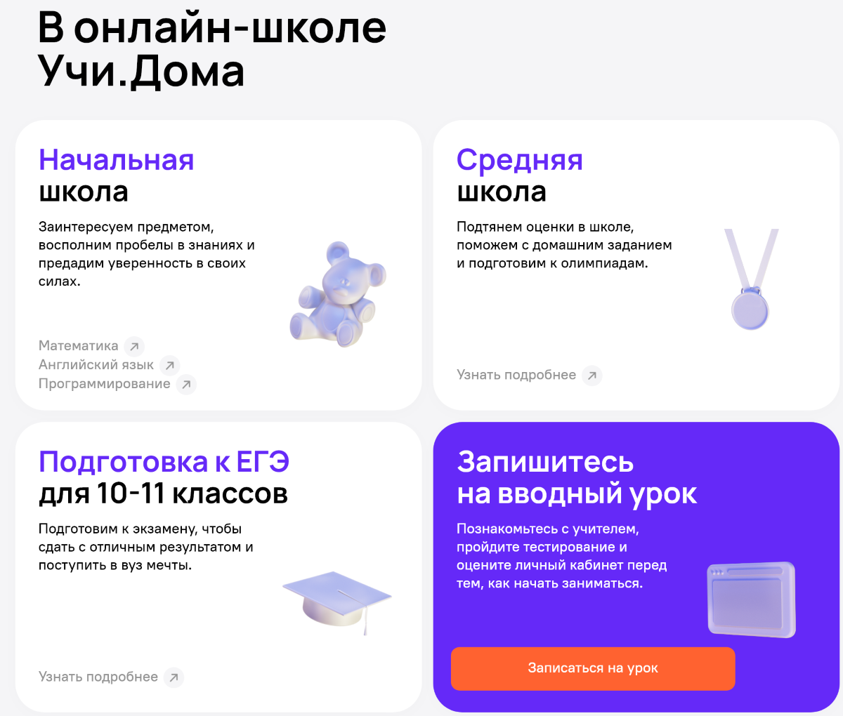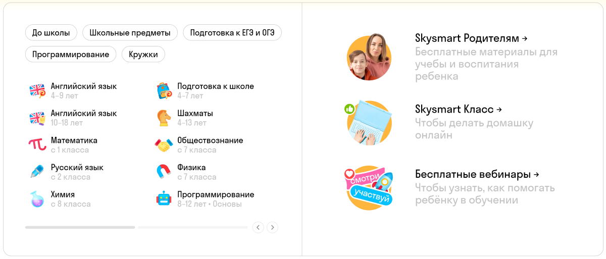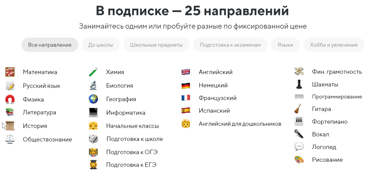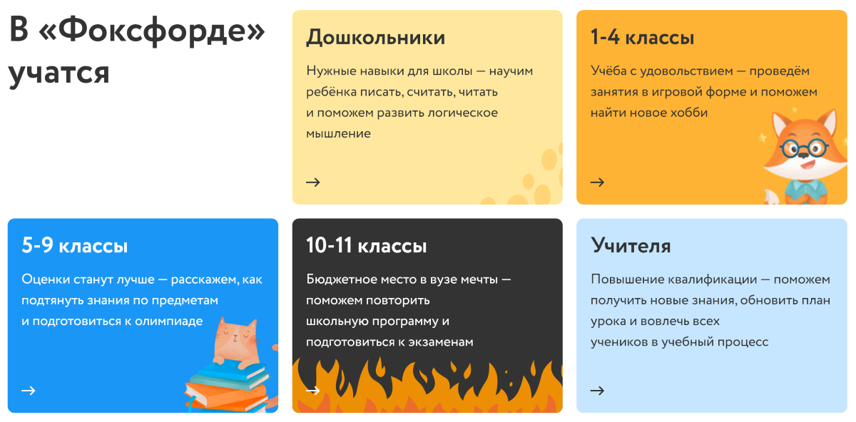 Дошкольников и учеников начальных классов здесь научат читать и писать, обучат английскому или даже основам программирования — и всё это в игровой форме. Школьникам 5-9 классов помогут улучшить оценки и подготовиться к олимпиадам. А старшеклассников подготовят к выпускным и вступительным экзаменам.