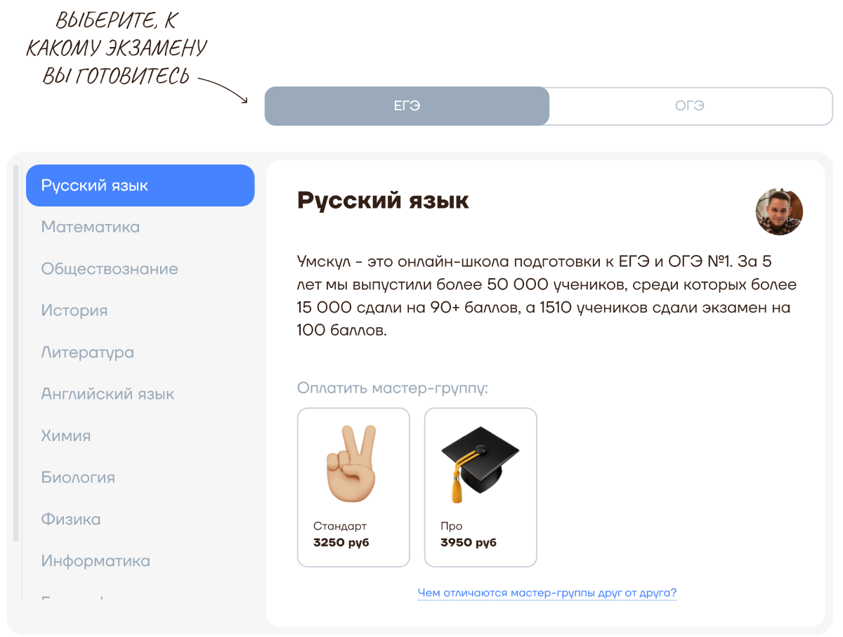 В Умскуле есть два типа мастер-групп — стандартная и продвинутая. В стандартной версии не будет личного куратора, игровой формы обучения и тёмной темы в личном кабинете. Стоимость стандартной версии — 3250 ₽ в месяц, продвинутой — 3950 ₽ в месяц.