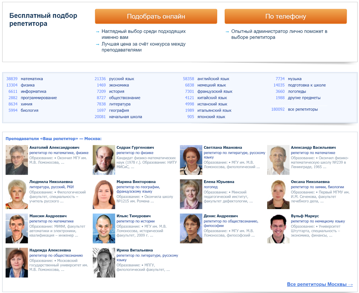 Агрегатор для поиска репетиторов. На сайте можно найти учителя хоть для подготовки к ЕГЭ, хоть для обучения рукоделию или корейскому языку. У каждого преподавателя есть рейтинг и отзывы.