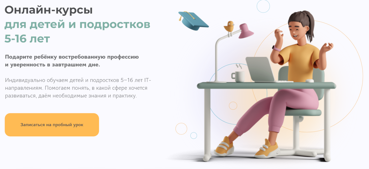 Это онлайн-школа it-профессий для детей от 8-16 лет. Индивидуальное обучение под интересы и увлечения ребенка, с реальным оплаченным проектом. Сервис помогает понять, в какой сфере ребёнок хочется развиваться, даёт необходимые знания и практику по профессиям: