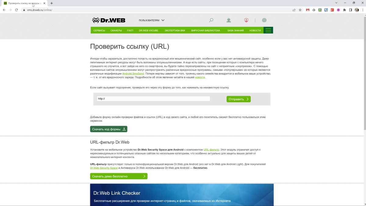 Сайт известной в узких кругах компании в области кибербезопасности. С его помощью можно легко проверить ссылку на вирусы. В отчёте вы получите общую информацию о состоянии ресурса, данные о сканировании файла, о наличии сайта в различных чёрных списках.