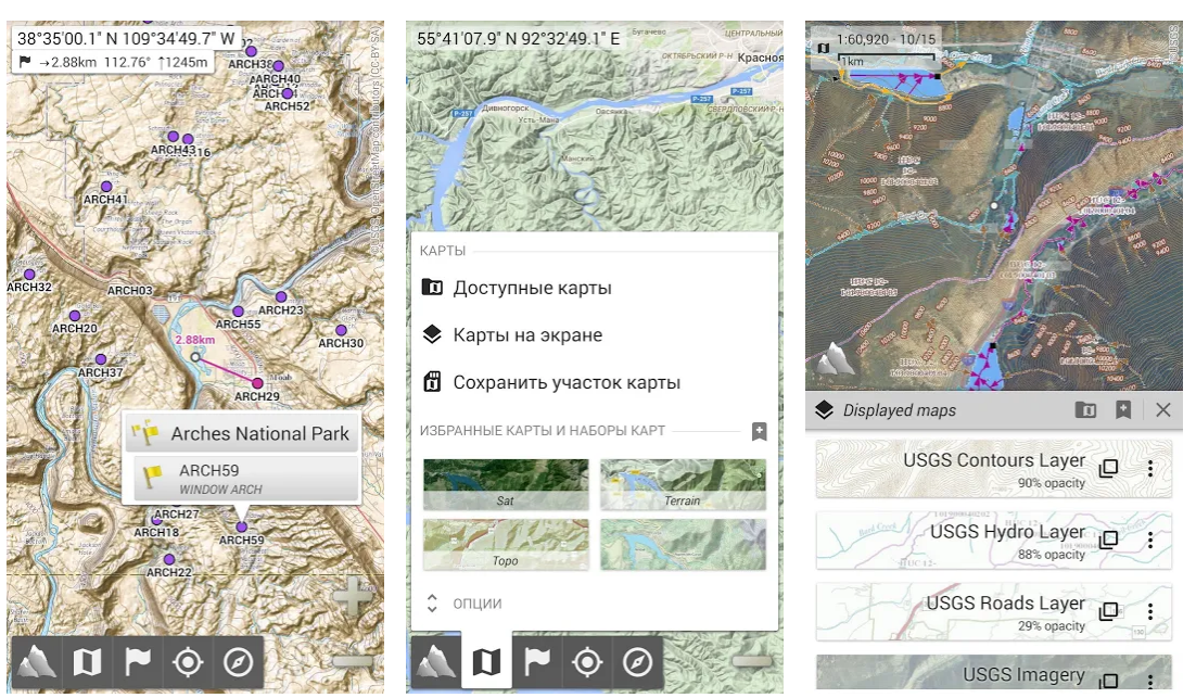 Карты можно сохранять на устройство для офлайн-работы. AlpineQuest также поддерживает различные файлы карт, такие как QCT и OZFx2. Есть поддержка GPS-навигации.
