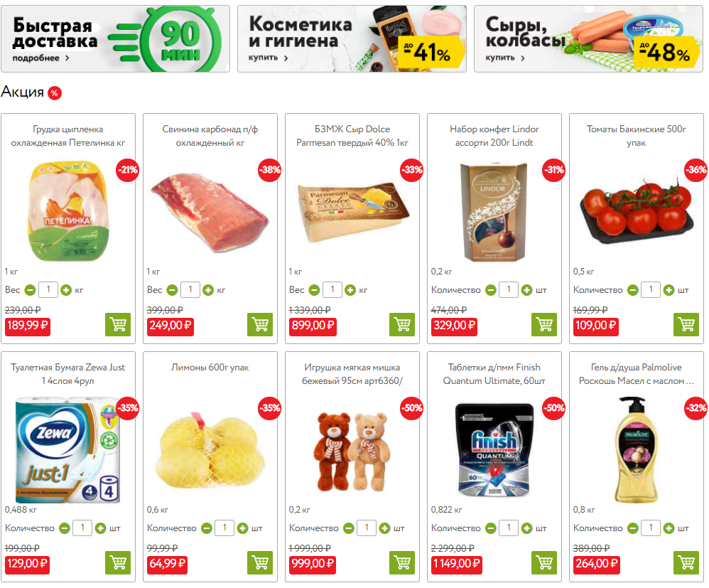 Есть возможность доставки день в день из каталога с более 100 000 товарами. Можно заказать продукты, бытовую химию, товары для дома и многое другое.
