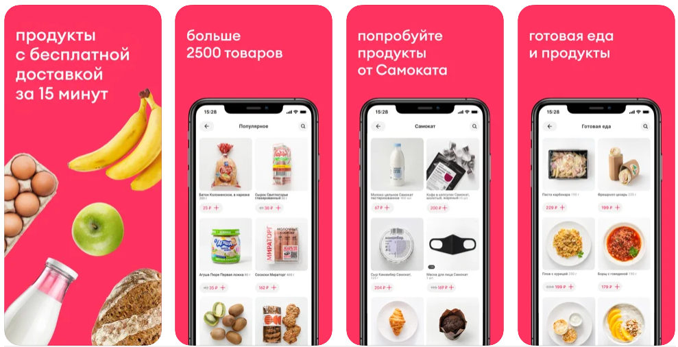 Минусы Самоката в виде работы всего в четырёх городах и каталога из 2500 товаров компенсируются скоростью доставки — 15 минут. Каталог включает: фрукты, овощи, молоко, хлеб, мясо, сладости, бытовые товары и товары для детей.