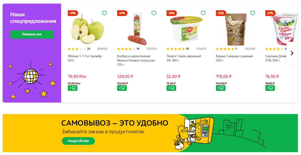 У сервиса есть свой даркстор (склад-магазин), где хранятся все товары и откуда собирается заказ на доставку. Доставка бесплатная.
