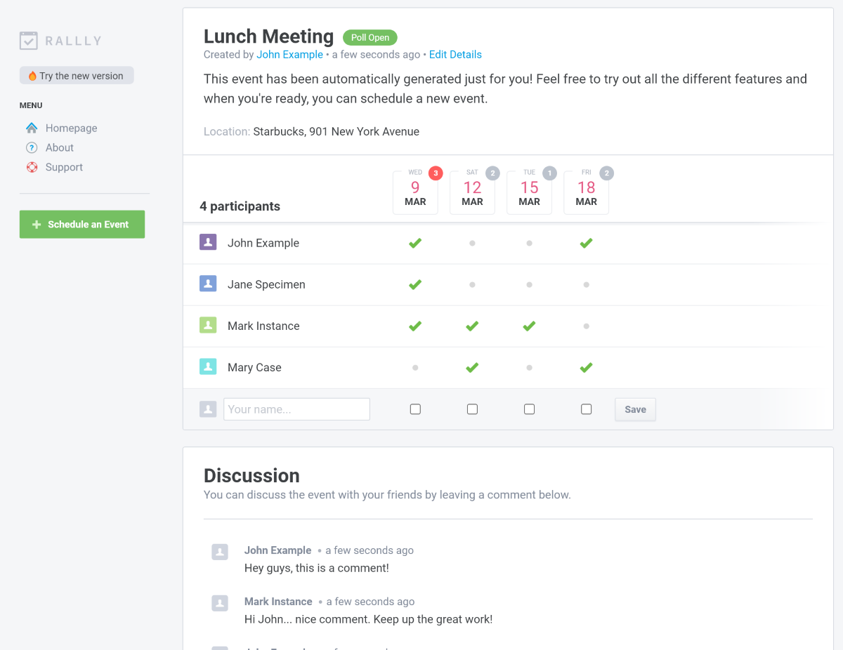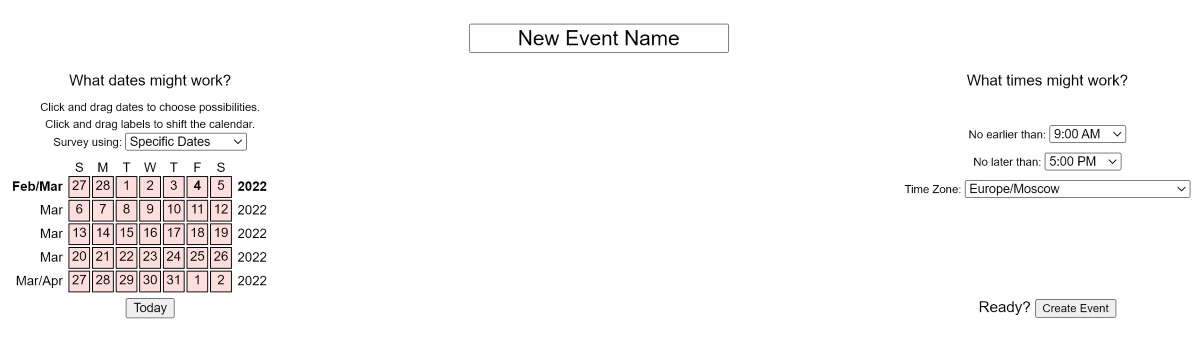 Здесь не так уж и много возможностей, зато вы сможете запланировать встречу абсолютно анонимно. Нужно просто выбрать доступные даты и поделиться ссылкой.