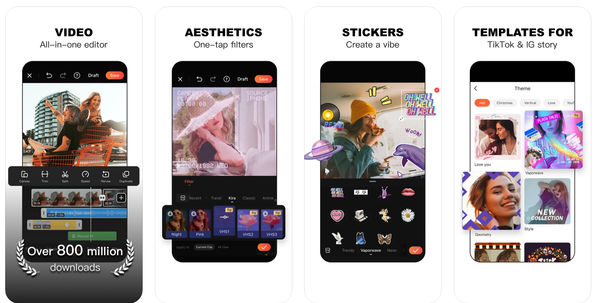 В этом бесплатном, шустром и простом видеоредакторе вы найдёте множество классных фильтров и эффектов. Помимо этого, можно обрезать, вырезать и разделять видео, а также добавлять к нему любую музыку из своего телефона.