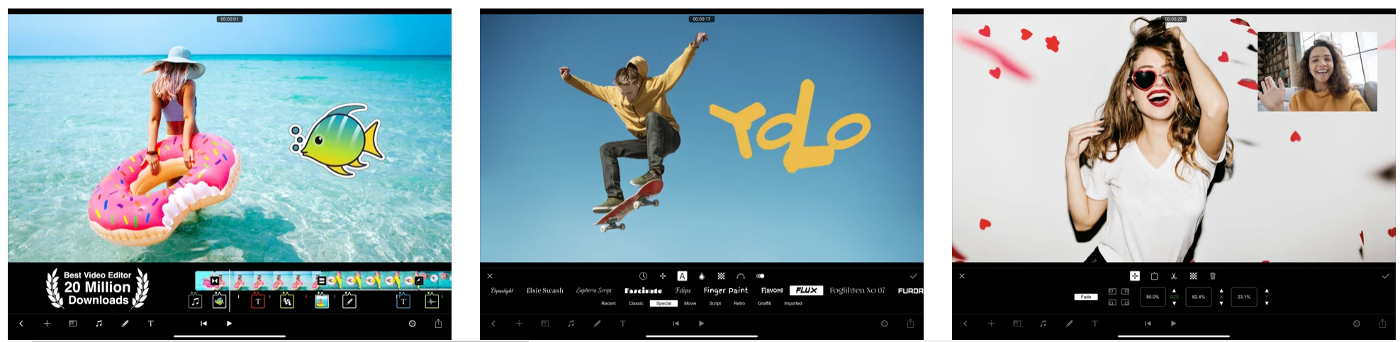 Приложение позволяет объединять несколько слоёв видео (PiP), картинок, стикеров, спецэффектов, текста и пр. Также можно улучшить цвет на ваших фото и видео.