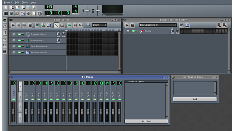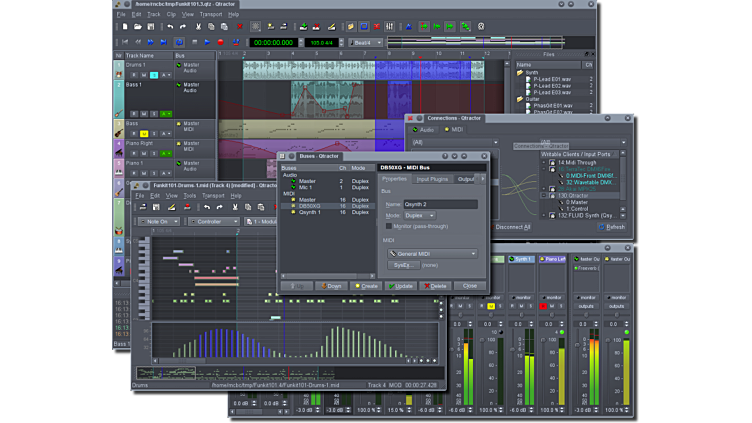 Крутой секвенсор с модульным интерфейсом, VST/ LV2-плагинами и возможностью работать как с аудио, так и с MIDI-композициями. Также он умеет в интеграцию с JACK.