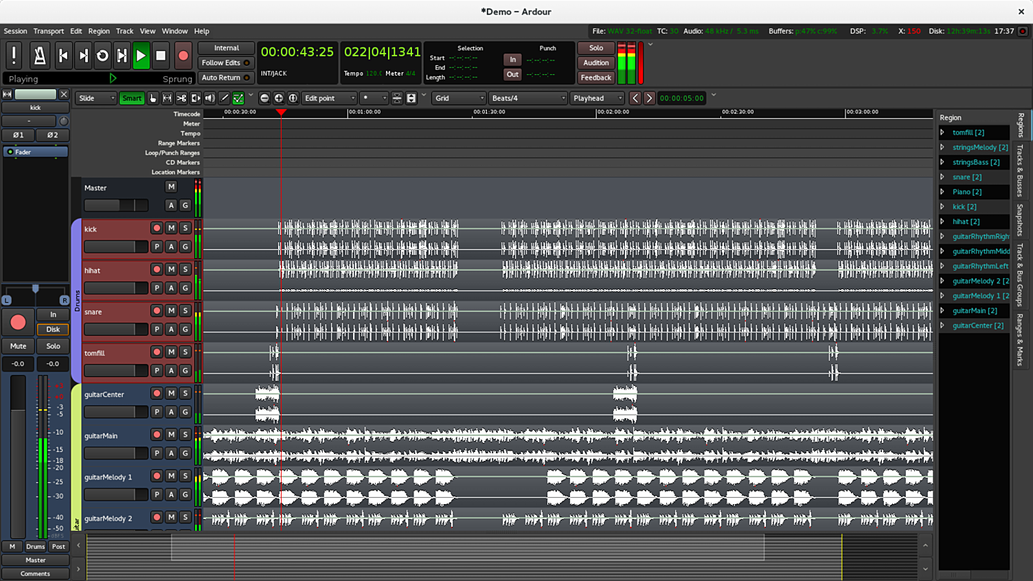 Вы сможете редактировать, сводить треки, работать вообще с любым количеством дорожек и различными аудиоформатами. Также здесь есть отличные возможности для работы с MIDI и интеграция с JACKIT.