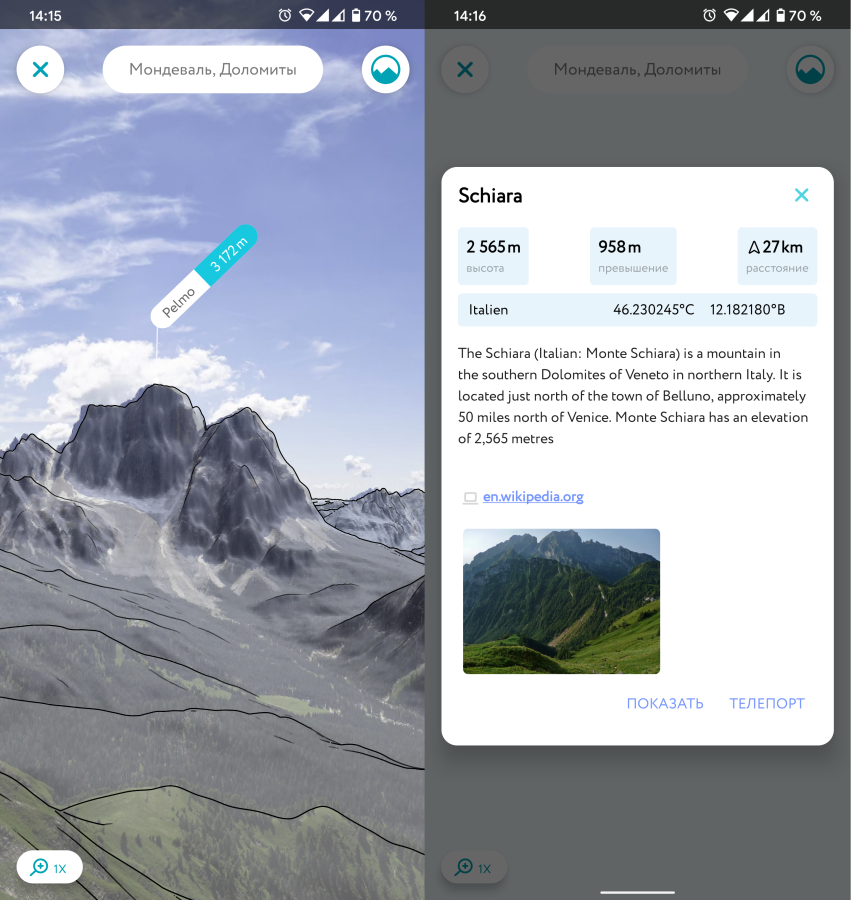 Чтобы распознать величественную гору на неё достаточно просто навести камеру. Над горой тут же появится её название и высота.