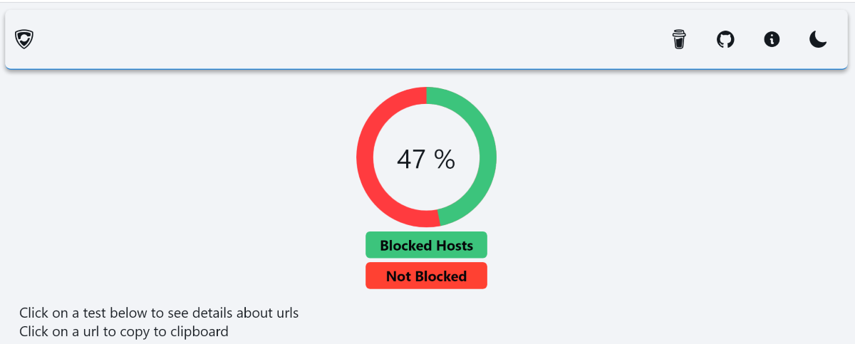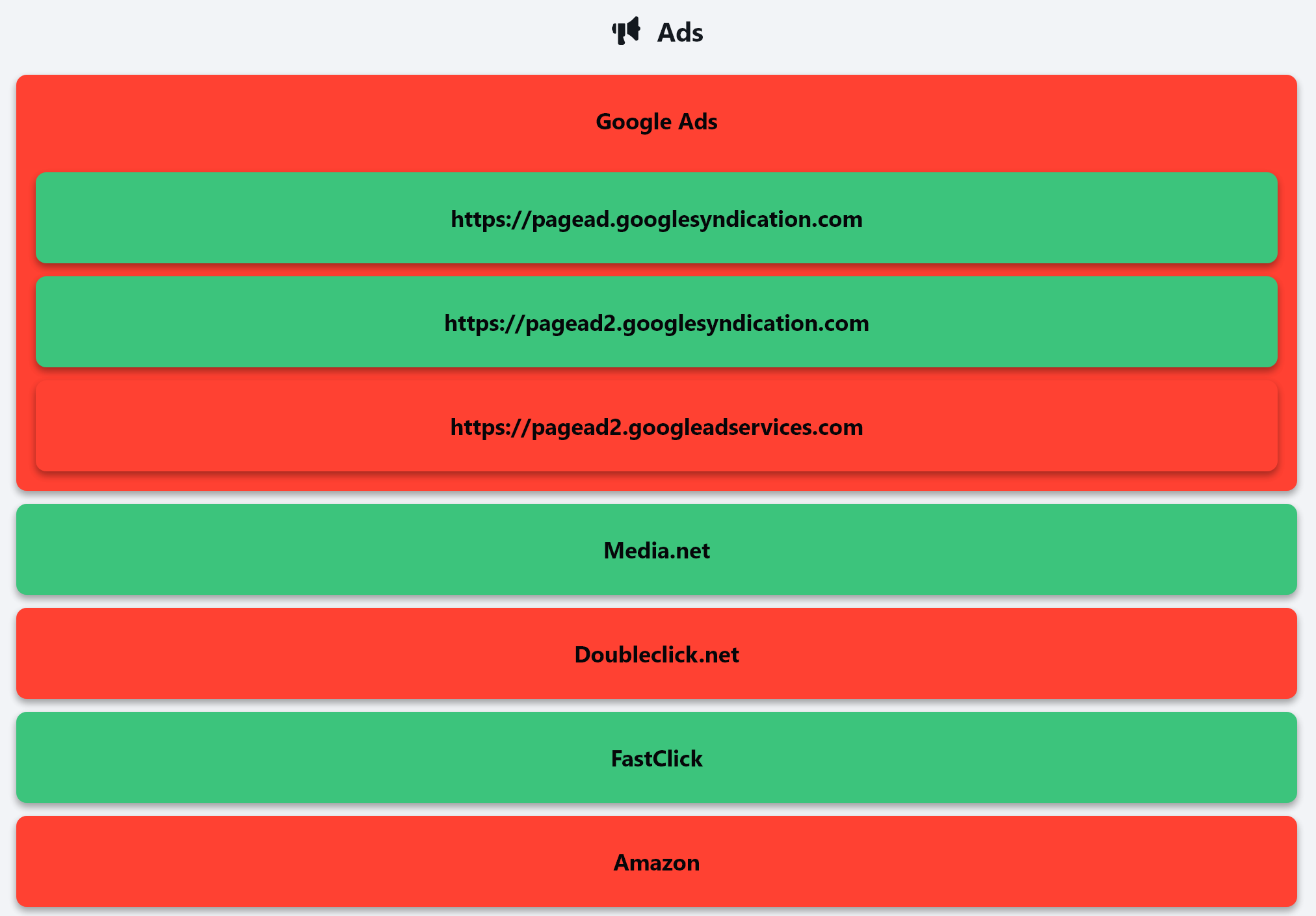 Результаты отображены в виде красных и зелёных пунктов. Красные — сайты, которые не блокируются решением. Зелёные, соответственно, — заблокированные. Если кликнуть по пункту, откроется список со ссылками, которые можно скопировать и добавить в свой блокировщик.