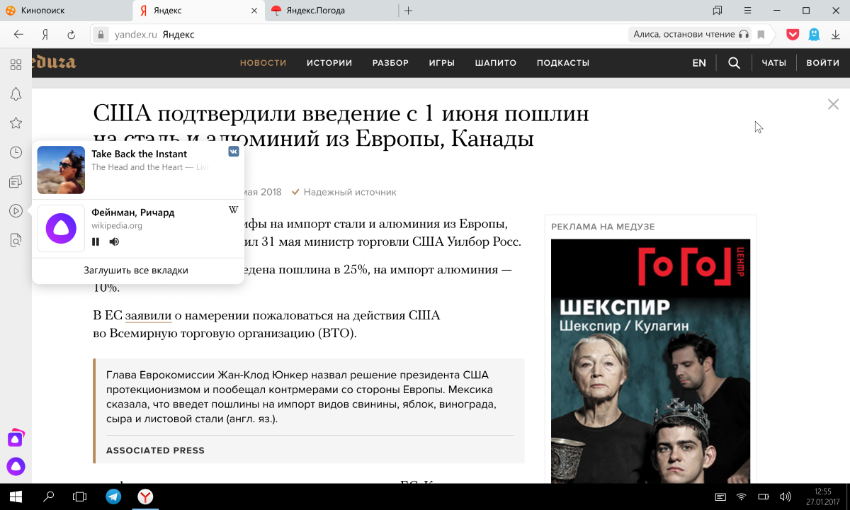 Страницы, где есть большой связный текст, Алиса озвучивает целиком. Причём читает только основной текст, не обращая внимания на кнопки, баннеры, пункты меню и другие посторонние элементы. Например, можно включить в Браузере статью, до которой никак не доходили руки, и под интересный рассказ разбирать фотографии.