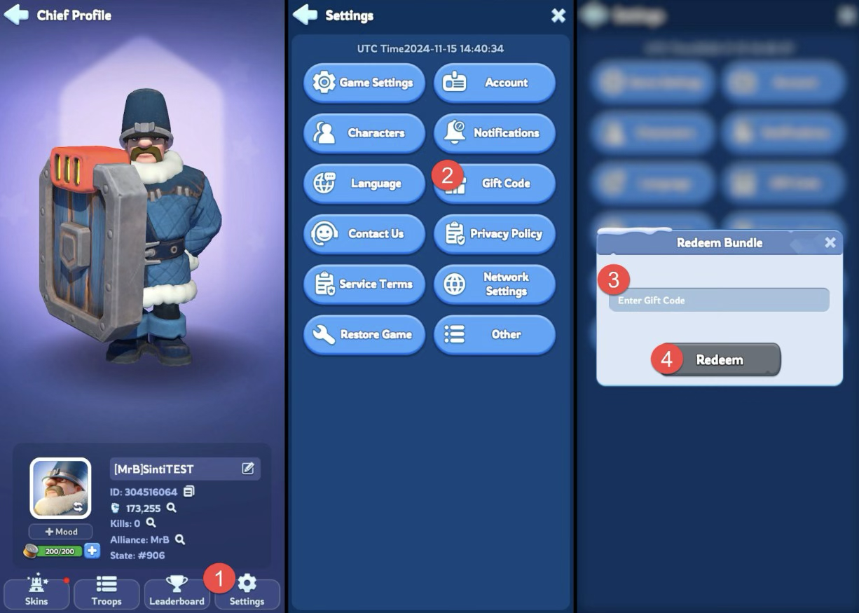 Now that you have the codes you wanna redeem, how do you get their rewards? There are two main ways but they depend on which platform you play Whiteout Survival on. If you’re an Android device player, then you can easily redeem a code through the game itself. However, any other platform requires you to redeem codes through the Gift Center website. This coincides with all other Century Games titles, so we’ll go over both options.