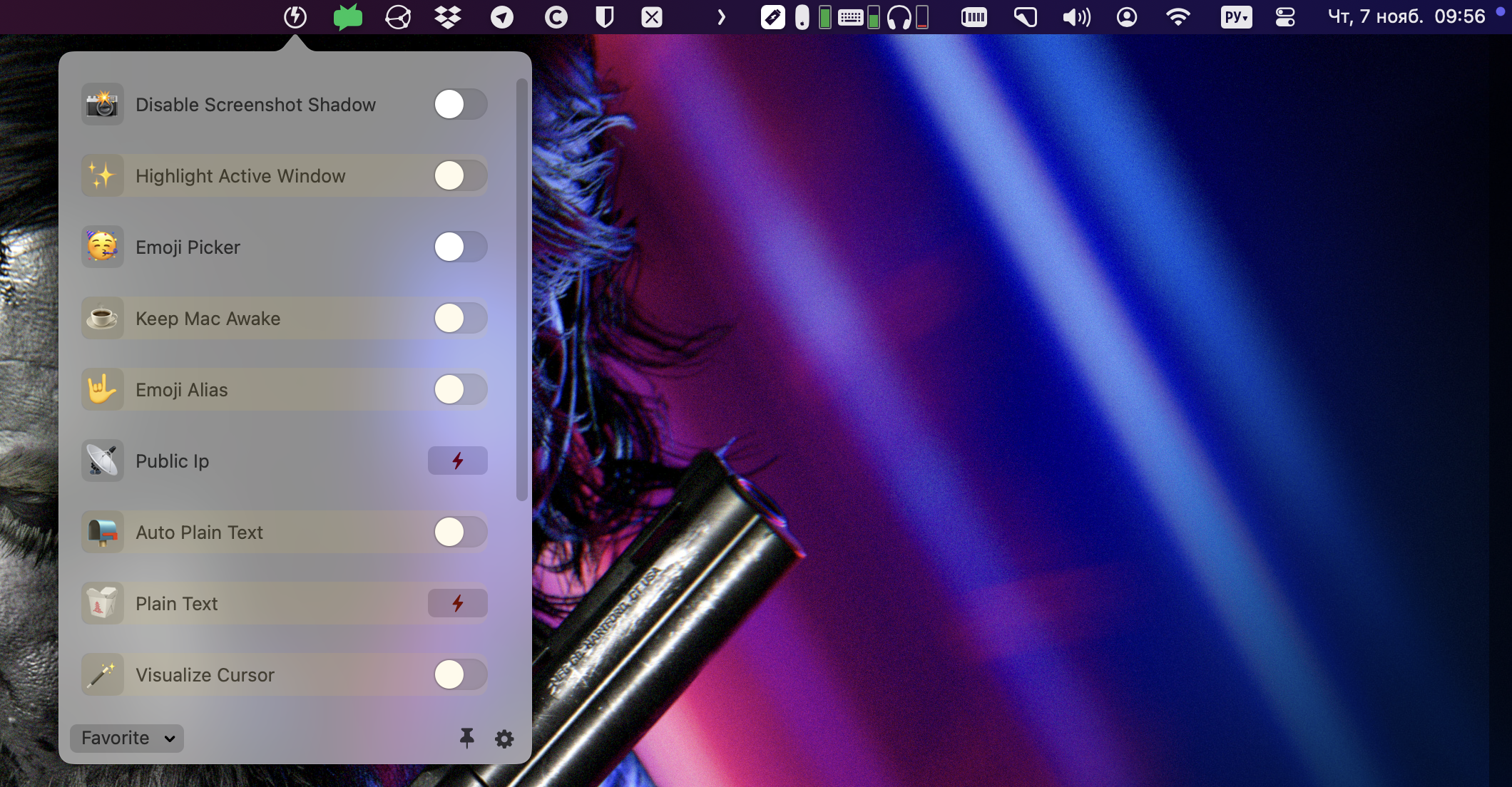 Быстро включить настройки можно из Строки меню. Здесь доступен весь раздел Избранное из основных настроек Almighty.