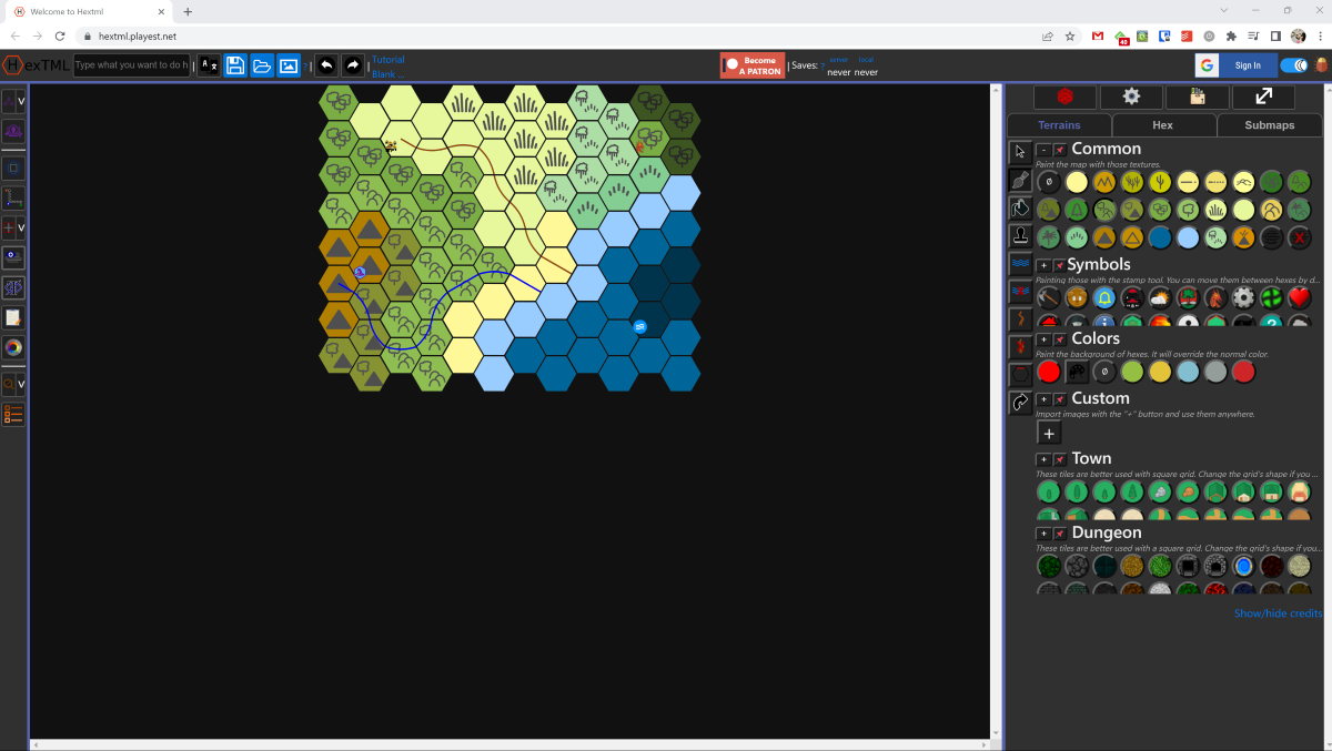 Онлайн-сервис для создания достаточно простеньких карт с шестиугольными ячейками. Можно трудиться над созданием карты вместе с друзьями. В работе используется HTML5. Если мало имеющихся значков для прорисовки местности, можно загрузить свои картинки.