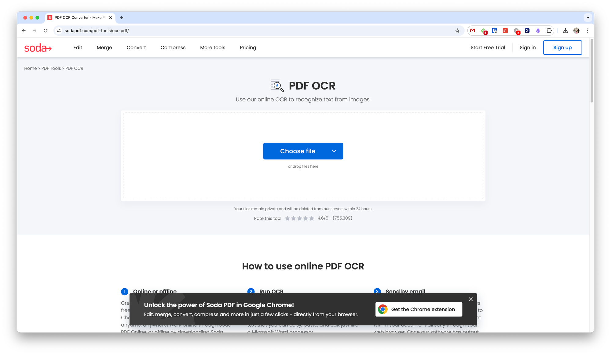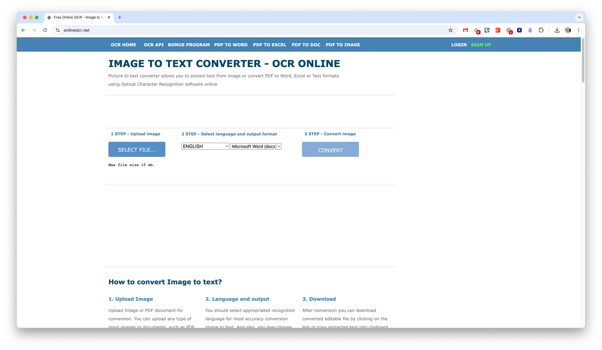 Ещё один бесплатный инструмент для распознавания текста с последующим сохранением результата в таких форматах, как docx, xlsx, txt. Программа распознаёт максимум 15 изображений в течение часа, регистрироваться при этом не требуется. Сервис поддерживает большое количество языков, в том числе славянские. Процесс распознавания не занимает много времени. Текст с хорошо отсканированного изображения получается хорошего качества. Если в тексте есть картинки, он недостаточно хорошо отсканирован, качество ухудшается. У сервиса есть лимит по размеру одного файла, максимальный размер — 5 Мб.