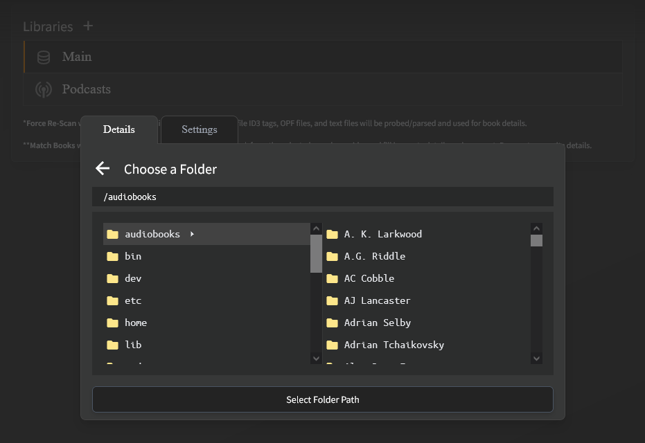 Вы можете подключить больше категорий книг, скопировав первую строку подключения тома, а затем изменив путь монтирования и имя привязки. После этого нужно обязательно перезапустить контейнер, чтобы приложение видело изменения при добавлении новой библиотеки.