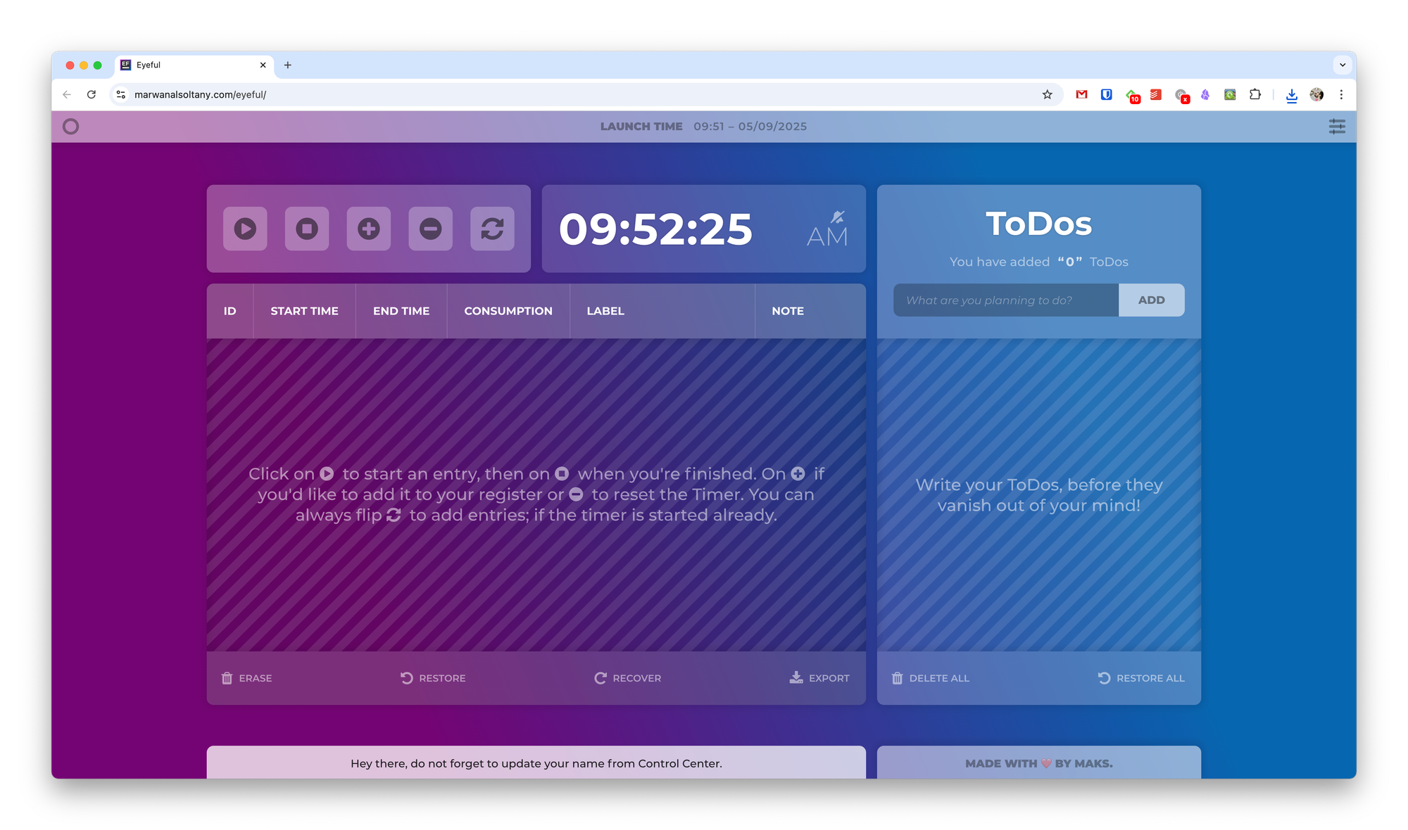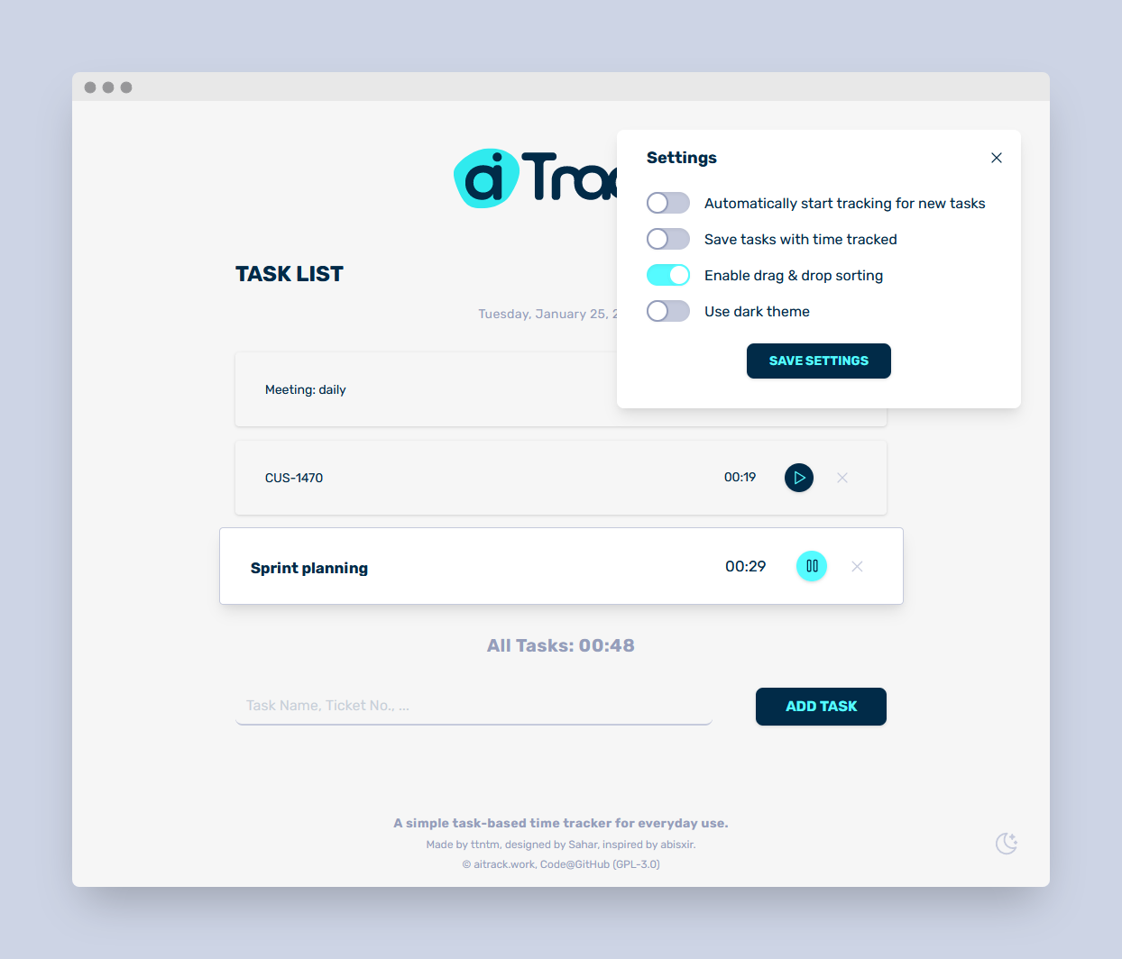 Ещё одно простое решение для отслеживания времени, потраченного на какие-то задачи. Просто создаёте задачу, запускаете таймер, и когда закончите, останавливаете таймер. Завершённые (и незавершённые) задачи будут сохранены в localStorage. Данные можно экспортировать и импортировать.