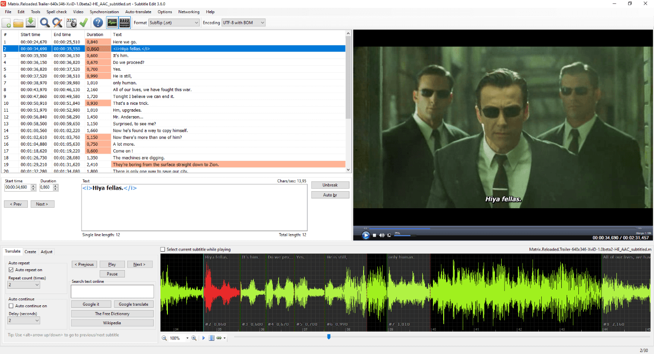 Вы сможете вручную отредактировать время в субтитрах, указав начало и конец, синхронизировать субтитры с видео, перевести их на другой язык (используется Google Переводчик), проверить субтитры на наличие орфографических ошибок, удалить лишние пробелы и т.д.