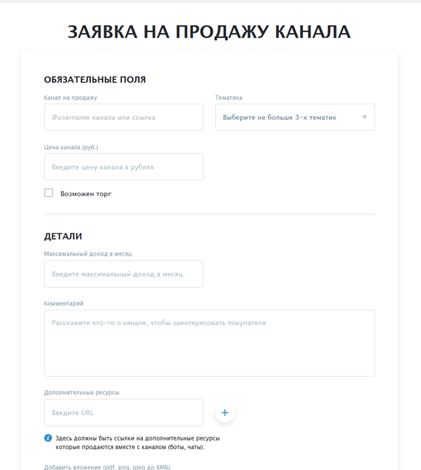 Чтобы внести свой канал в список «На продажу», нажми «Продать канал» в верхней части страницы. Заполни заявку.