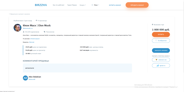 Кнопка «Купить» приведёт к переписке с продавцом — его можно пытать насчёт характеристик канала. Если канал соблазнительный, а владелец мутный,воспользуйся услугами «Анализ канала» или «Подбор канала».