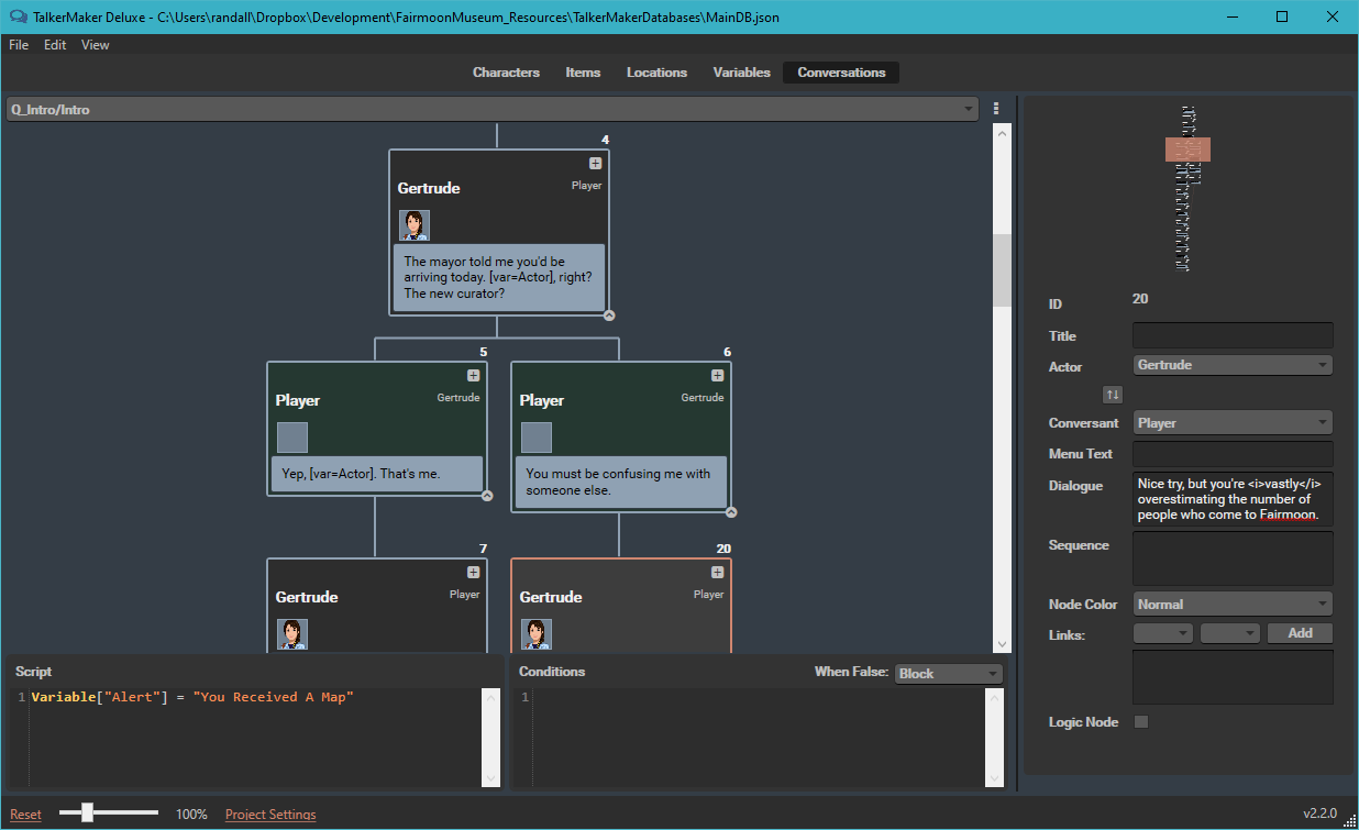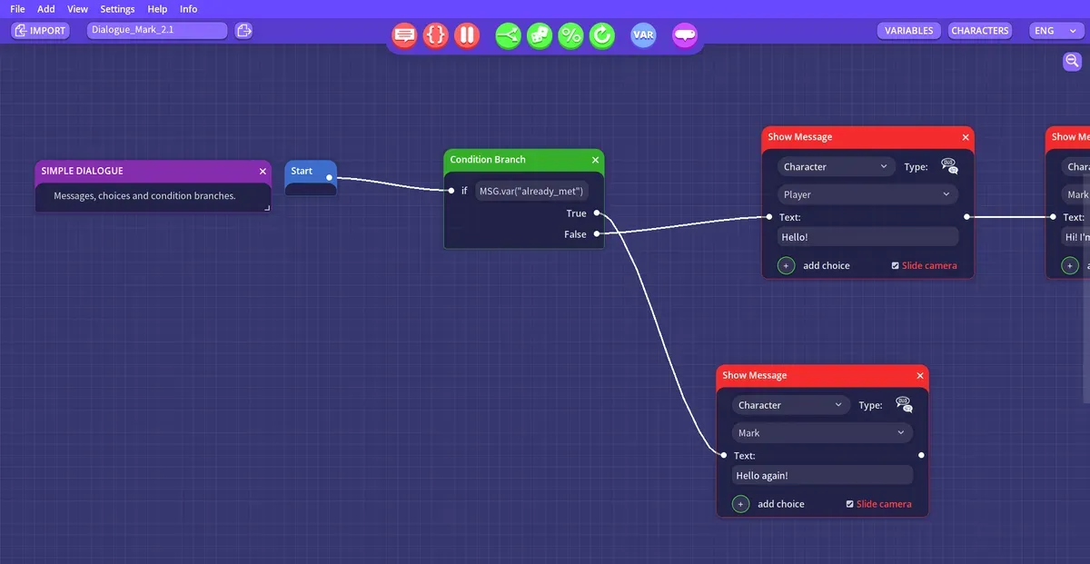 Помогает авторам создавать и управлять диалогами и персонажами в играх, фильмах, анимации и других мультимедийных проектах. Здесь есть всё необходимое для создания и редактирования диалоговых сцен, задания эмоций и тонов голоса персонажей, управления выборами и ответами игроков, а также другие функции, связанные с диалоговой системой.