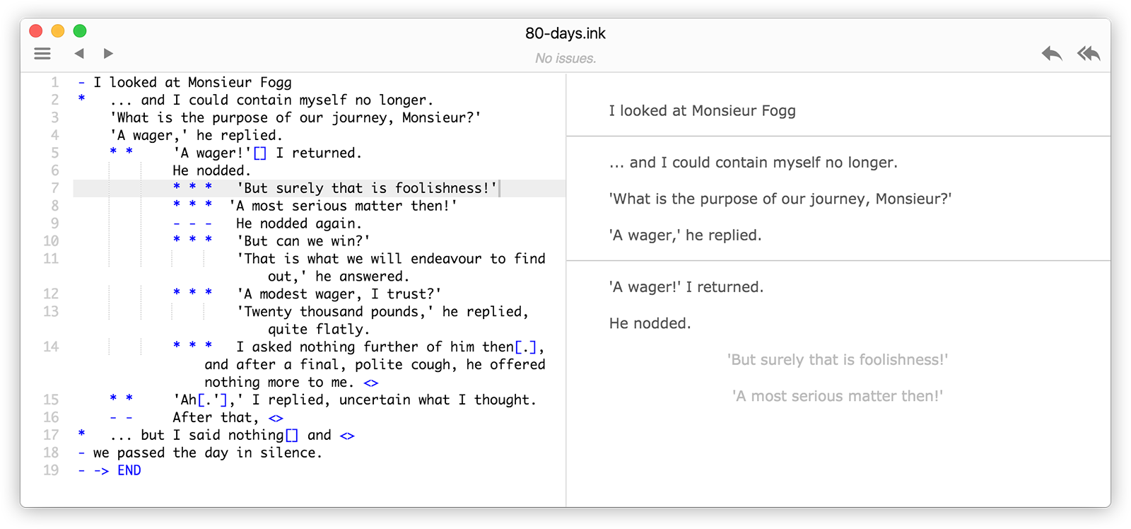 Возвращаемся к бесплатным вариантам. ink — это язык и инструмент для создания интерактивных историй. Он был разработан компанией Inkle и предназначен для авторов, которые хотят создавать текстовые приключенческие игры, интерактивные повествования и прочие формы интерактивной литературы. Есть интеграция с игровыми движками. Например, он может использоваться в Unity или в качестве отдельного модуля для разработки текстовых приключенческих игр.