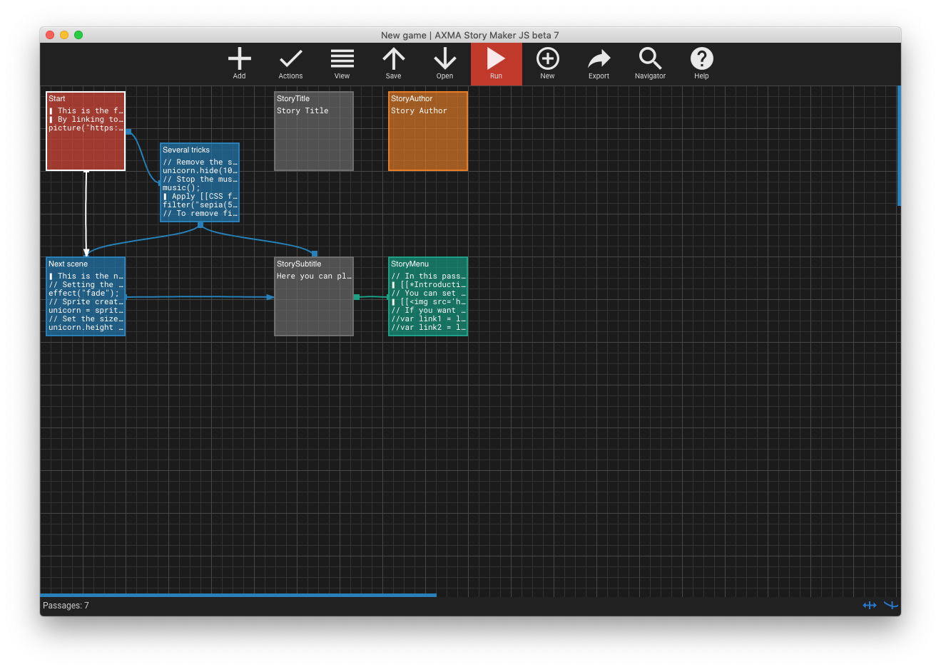 Тоже бесплатное и опенсорсное решение. Подойдёт для создания визуальных новелл, интерактивных историй и текстовых адвенчур. Как понятно из названия, приложение написано на JavaScript без использования сторонних библиотек. Есть поддержка фреймворка Apache Cordova, что упрощает разработку нативных мобильных и десктопных приложений. Движок использует стандартные HTML-элементы, а сам сценарий хранится в JSON-структуре.