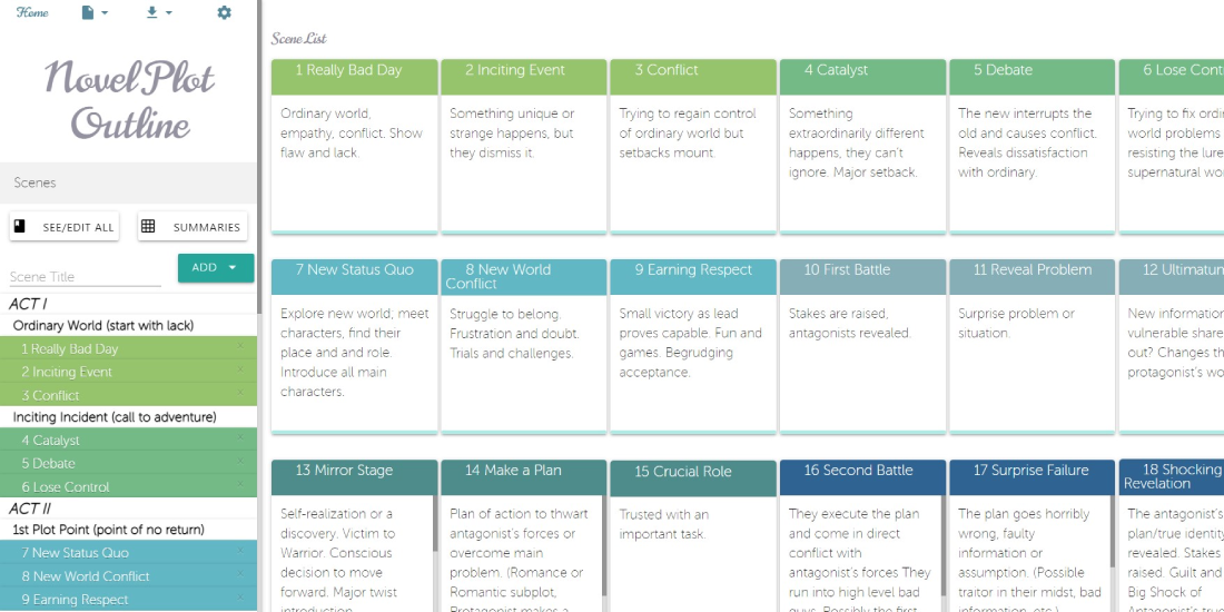 Подойдёт для создания сюжетной линии и структуры истории. Есть визуальное представление сюжетной линии, организация персонажей и элементов сюжета, таймлайн и временные рамки.