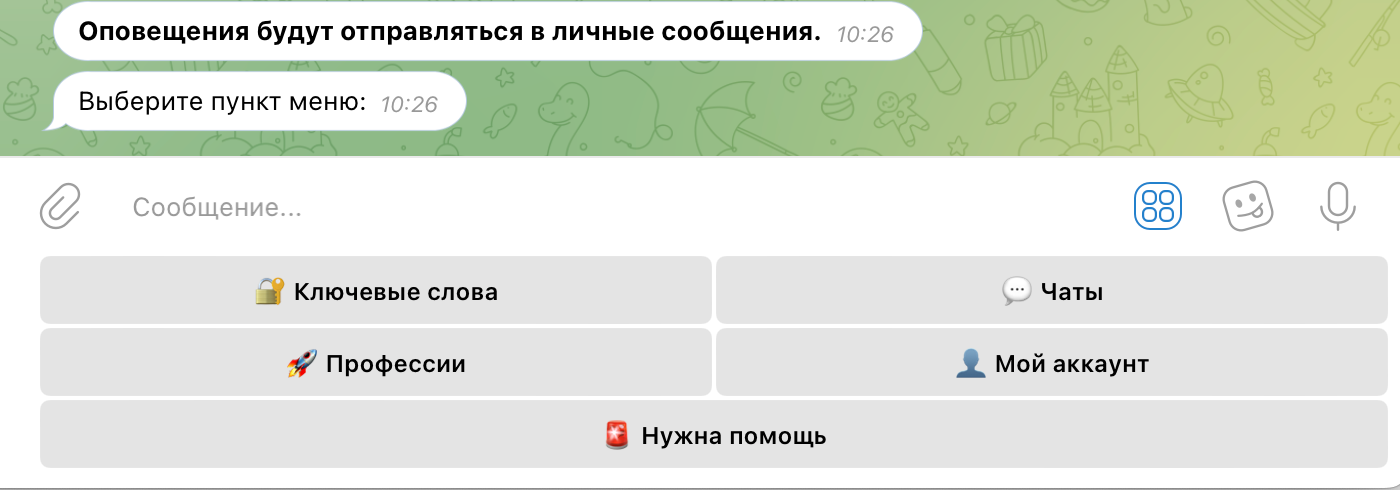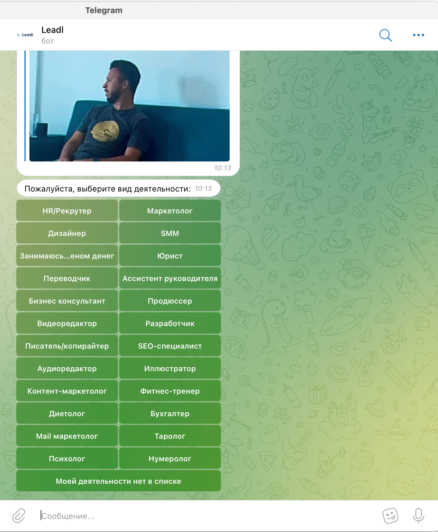 При первом запуске бота вам будет предложено выбрать ваш вид деятельности: HR, маркетолог, разработчик и прочее. Честно говоря, оно ни на что не влияет, и всегда можно выбрать пункт Моей деятельности нет в списке.