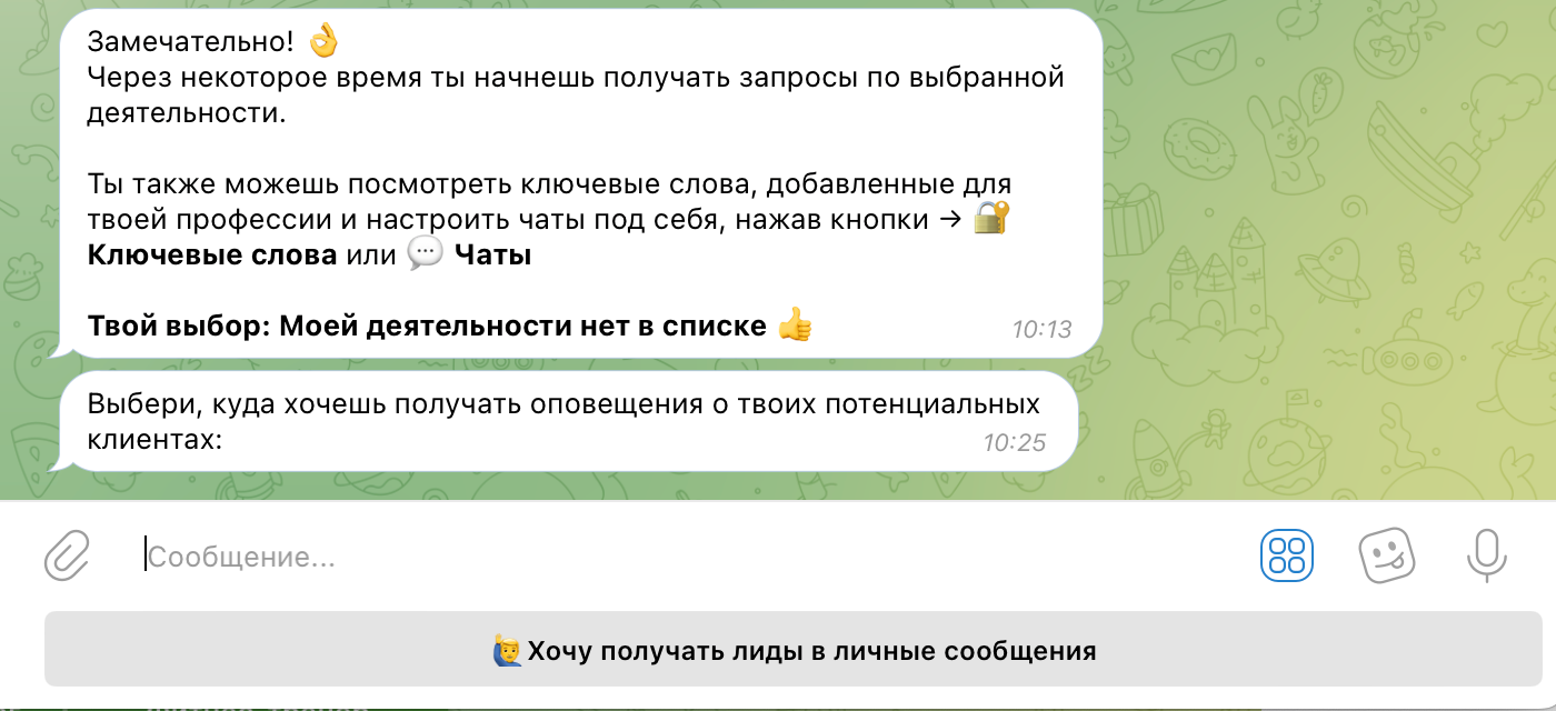 Leadl — бот для Telegram, который мониторит сообщения в чатах и при совпадении ключевых слов присылает вам об этом информацию.