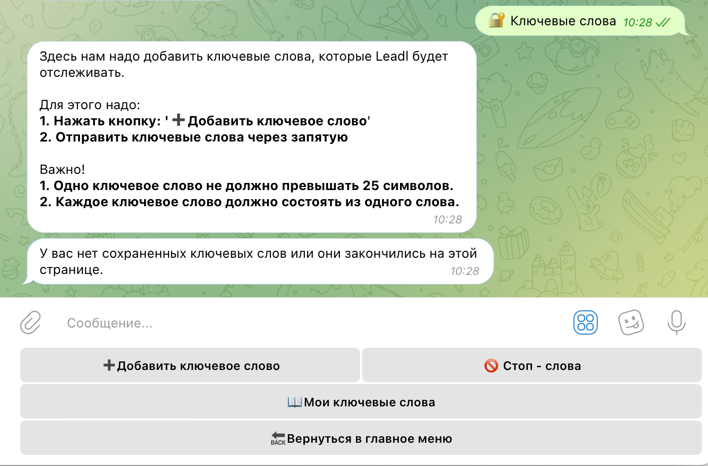 И только теперь начинается самая интересная часть настройки. Вам нужно выбрать слова, которые будет отслеживать бот, и добавить их в чаты с потенциальными лидами.