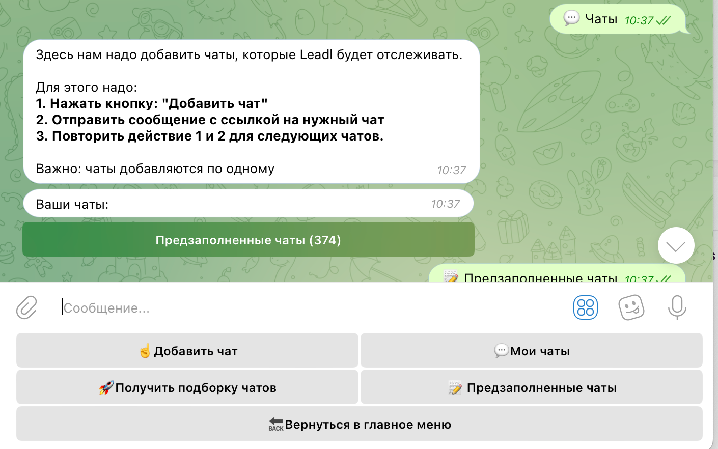 Далее нужно нажать на кнопку Чаты и отправить боту ссылки на чаты, в которых планируется вылавливать лиды. Ссылки нужно отправлять по одной.