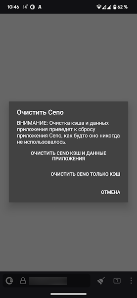 Ещё стоит отметить наличие фишек, влияющих на безопасность. Например, лёгкая очистка кеша браузера и данных приложения.