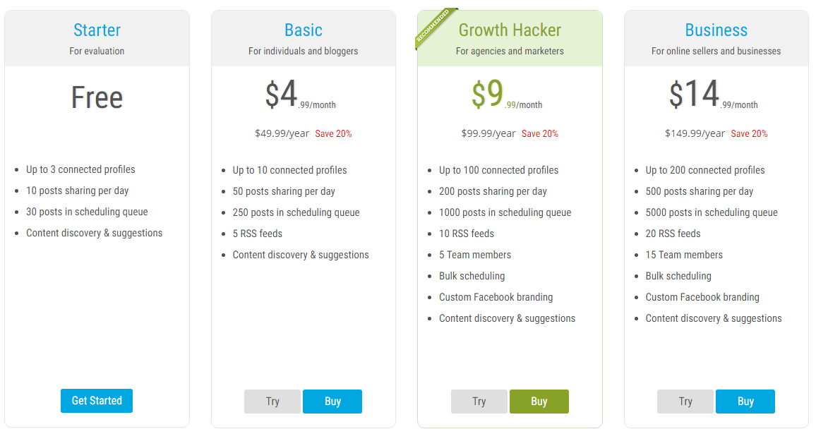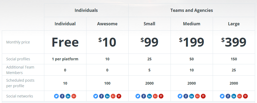 Стоимость — это именно то, что меня отталкивает от использования любых других сервисов, кроме Buffer и SocialPilot. В этой категории, безусловно, выигрывает SocialPilot. Его бесплатного тарифа с лихвой хватит даже профессиональным блогерам: