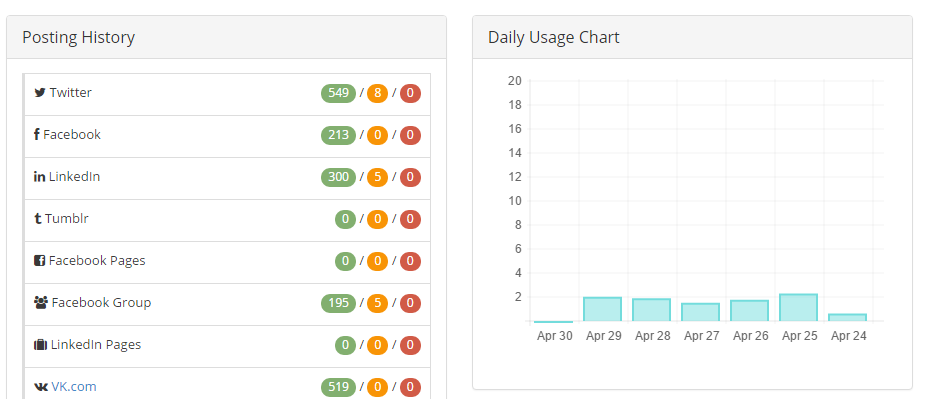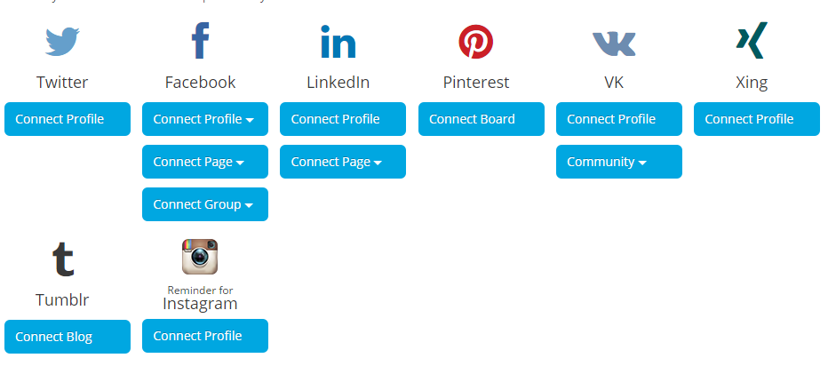 SocialPilot поддерживает восемь различных социальных сетей. В дополнение к тому, что умеет конкурент, здесь вы найдёте профиль и сообщество Вконтакте, Xing, Tumblr и Instagram — очко в пользу «пилота».