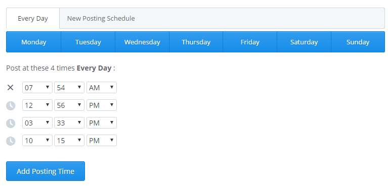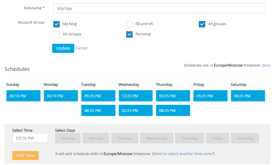 Buffer на бесплатном тарифе позволяет задать время на всю неделю, но для любого аккаунта. Как и в случае с SP, вы можете задать любому посту индивидуальное время.