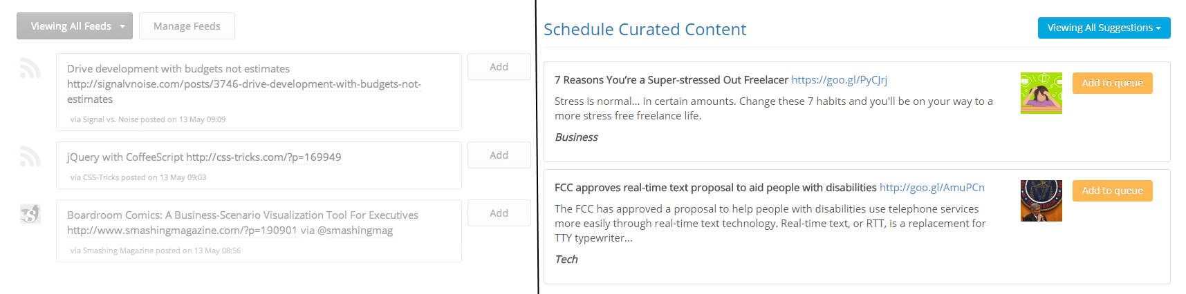 Поиск контента помогает разбавить ленту постов свежим и интересным содержимым. Оба сервиса предлагают новый контент на основе RSS-лент или пост может быть предложен одним из членов команды.