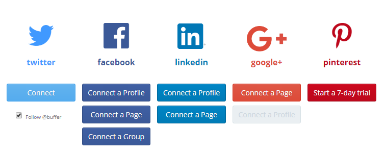 Наверное, наиболее важным при выборе сервиса для кросспостинга, будет количество поддерживаемых социальных сетей. Buffer поддерживает пять профилей: Twitter, Facebook (профиль, страница или группа), LinkedIn (профиль или страница), страницы в Google+ и Pinterest (за деньги).