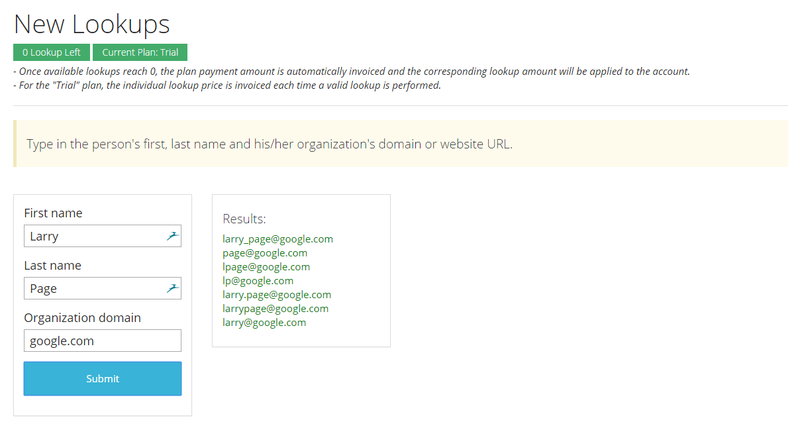 Для поиска по базе EmailFinder нужно просто указать имя и фамилию человека и сайт организации, в которой он работает.