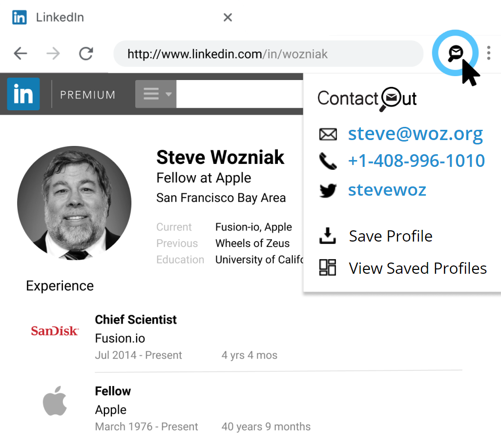 С помощью расширения можно произвести поиск по LinkedIn и вытянуть контактную информацию о пользователе сети: почта, телефон и ссылки на социальные сети.
