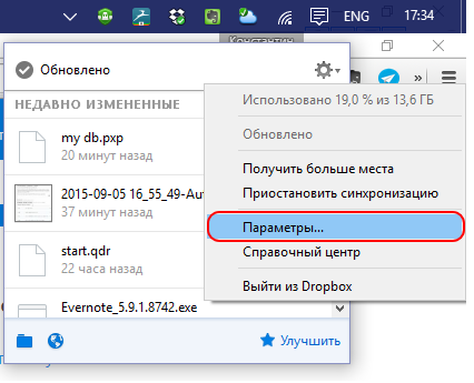 Чтобы ограничить скорость, потребляемую сервисом, откройте настройки приложения. Для этого кликните правой кнопкой мыши по иконке Dropbox рядом с часами и нажмите "Параметры":